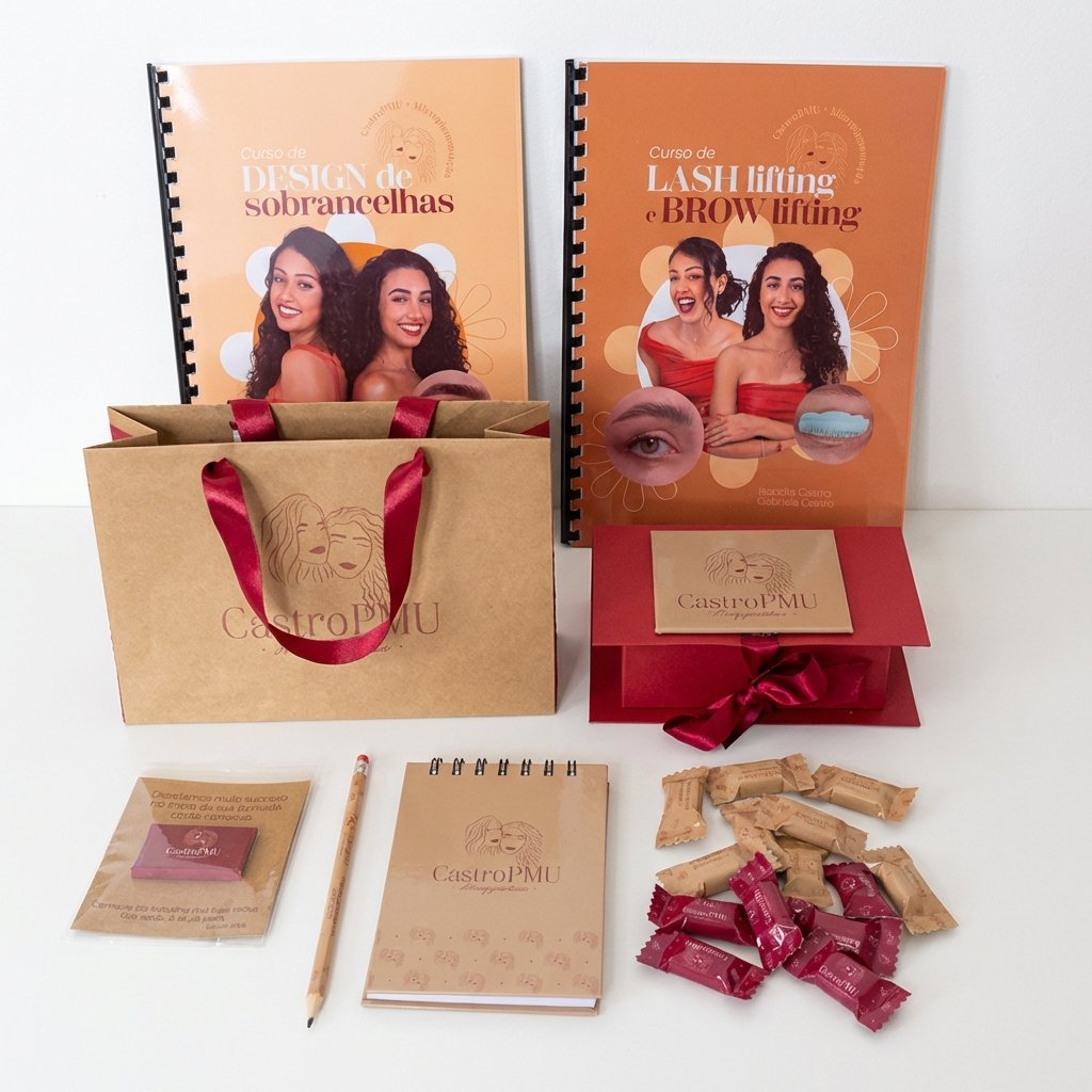 Kit de divulgação personalizado para cursos, eventos e formações, criado sob medida conforme a identidade visual e a necessidade de cada projeto. Os kits podem incluir materiais como bloco de notas, apostila ou caderno, caneta ou lápis, adesivos, balas personalizadas e embalagem em sacola ou caixa.