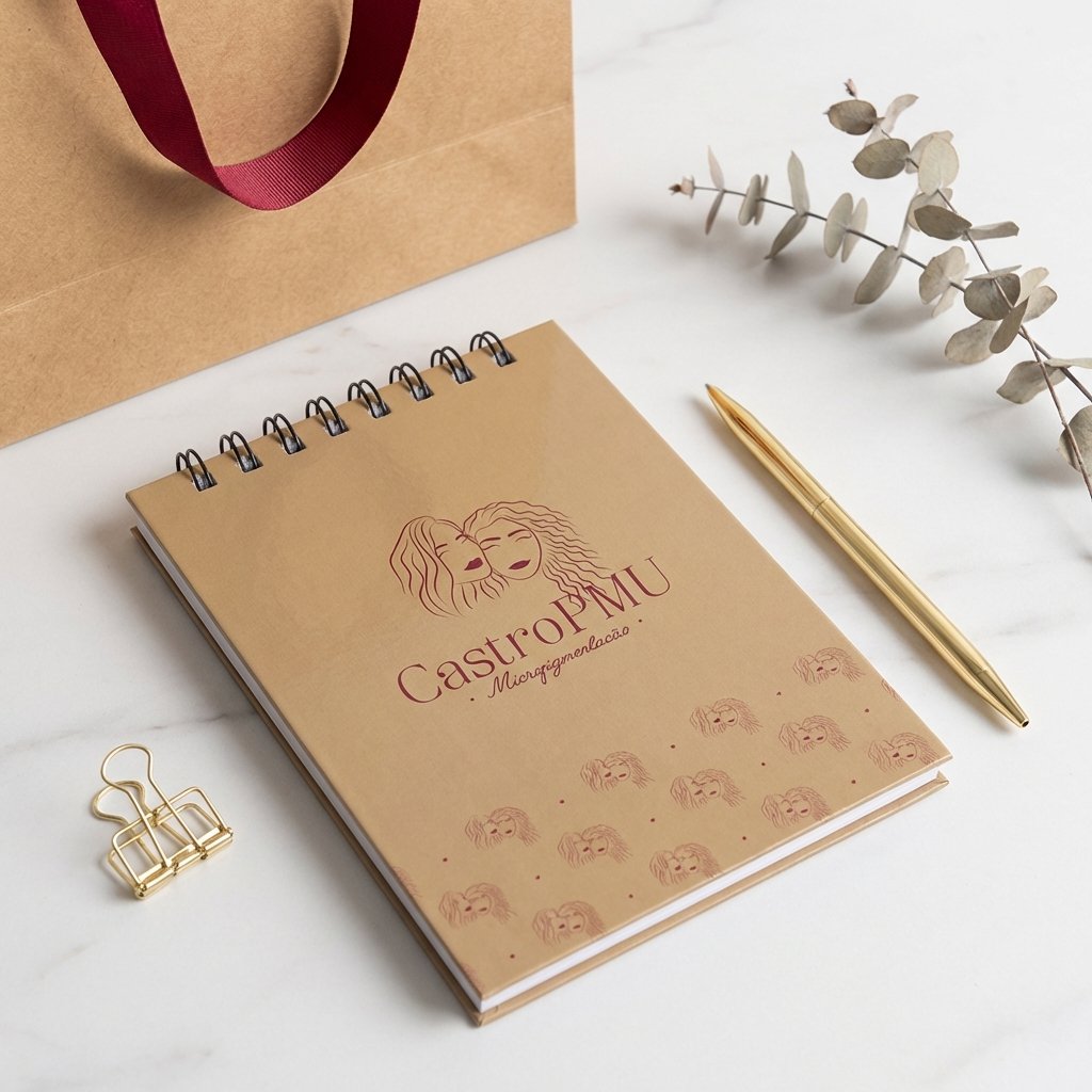 Bloco de notas personalizado desenvolvido sob medida para cursos, eventos e kits de divulgação. Disponível em diferentes tamanhos, com opção de páginas pautadas ou sem pauta e quantidade de folhas personalizada, conforme a necessidade e identidade visual de cada projeto.